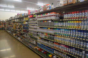 In the paint area, we stock tintable Valspar paint and Cabot stain, as well as Kilz and Zinsser primer. There are also several different types of spray paints from Rust-oleum. You can also products find Miniwax stain and polyurethane, DAP and Through the Roof caulk, and Gorilla glue.